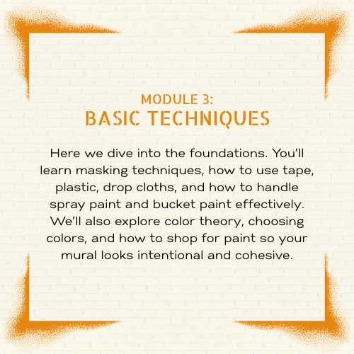 Learn everything you need to paint your first mural with 7 modules and 4+ hours of guided lessons